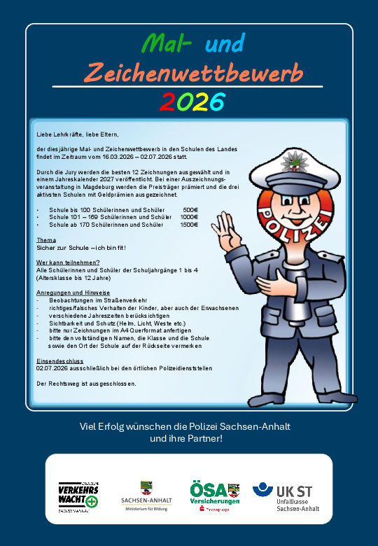 Auch in diesem Jahr ruft die Polizei des Landes Sachsen-Anhalt zusammen mit der Unfallkasse Sachsen-Anhalt, der ÖSA, der Landesverkehrswacht und dem Ministerium für Bildung wieder zur Teilnahme am landesweiten Mal- und Zeichenwettbewerb für die Schülerinnen und Schüler der Schuljahrgänge 1 bis 4 der Grund- und Förderschulen auf. Das Thema in diesem Jahr lautet: